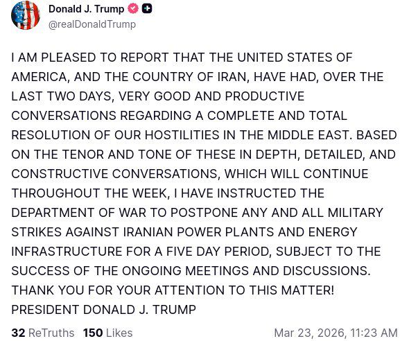 בפוסט טראמפ כותב כי לבסוף הורה למשרד המלחמה "לדחות כל תקיפה צבאית" נגד תחנות הכוח ותשתיות האנרגיה של איראן לתקופה של חמישה ימים.
