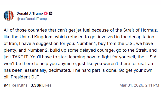 הנשיא, באומרו עוקץ את בריטניה שסירבה לעזור במאבקה של ארה"ב מול איראן, ומציע לבריטניה להיאבק בעצמה: "תבנו אומץ ולכו למצר הורמוז ופשוט קחו את זה. ארה"ב כבר לא תהיה שם כדי לעזור לכם, בדיוק כמו שלא הייתם שם בשבילנו. איראן, למעשה, הושמדה. החלק הקשה נגמר. לכו תשיגו נפט משלכם!".