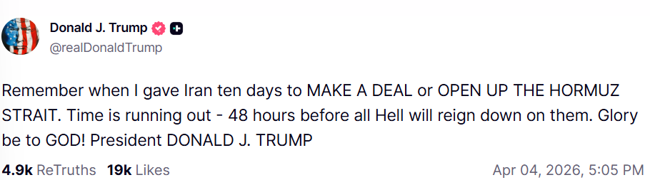 נשיא ארה"ב, דונלד טראמפ, מציין היום (שבת) בחשבון ה-Truth שלו כי "לאיראן יש עוד 48 שעות להסכים לעסקה או לפתוח את מצר הורמוז". הנשיא מכריז כי אם לא "ארה"ב תטיל הרס וגיהנום".