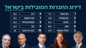 בנק לאומי של חנן פרידמן שומר על המקום הראשון עם שווי שוק של 77.1 מיליארד שקל, ירידה קלה משבוע שעבר אז עמד שוויו על 78.5 מיליארד שקל, אך עדיין בפער מהמקום השני – בנק הפועלים של ידין ענתבי, שרושם השבוע שווי שוק של 70.8 מיליארד שקל, עלייה קלה משבוע שעבר אז עמד שוויו על 70.5 מיליארד שקל. במקום השלישי: אלביט עם שווי שוק של 61.4 מיליארד שקל – ירידה משבוע שעבר אז עמד שווי השוק של אלביט על 67.1 מיליארד שקל. מניית אלביט ירדה בימים האחרונים בכ-10%.