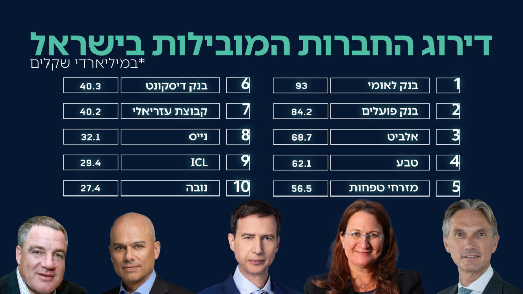 במקום החמישי ניצב בנק מזרחי-טפחות בהובלת משה לארי, עם שווי שוק של 56.534 מיליארד שקל – המשך התחזקות מרשימה, לאחר שנסחר לאחרונה סביב 50.7 מיליארד שקל.